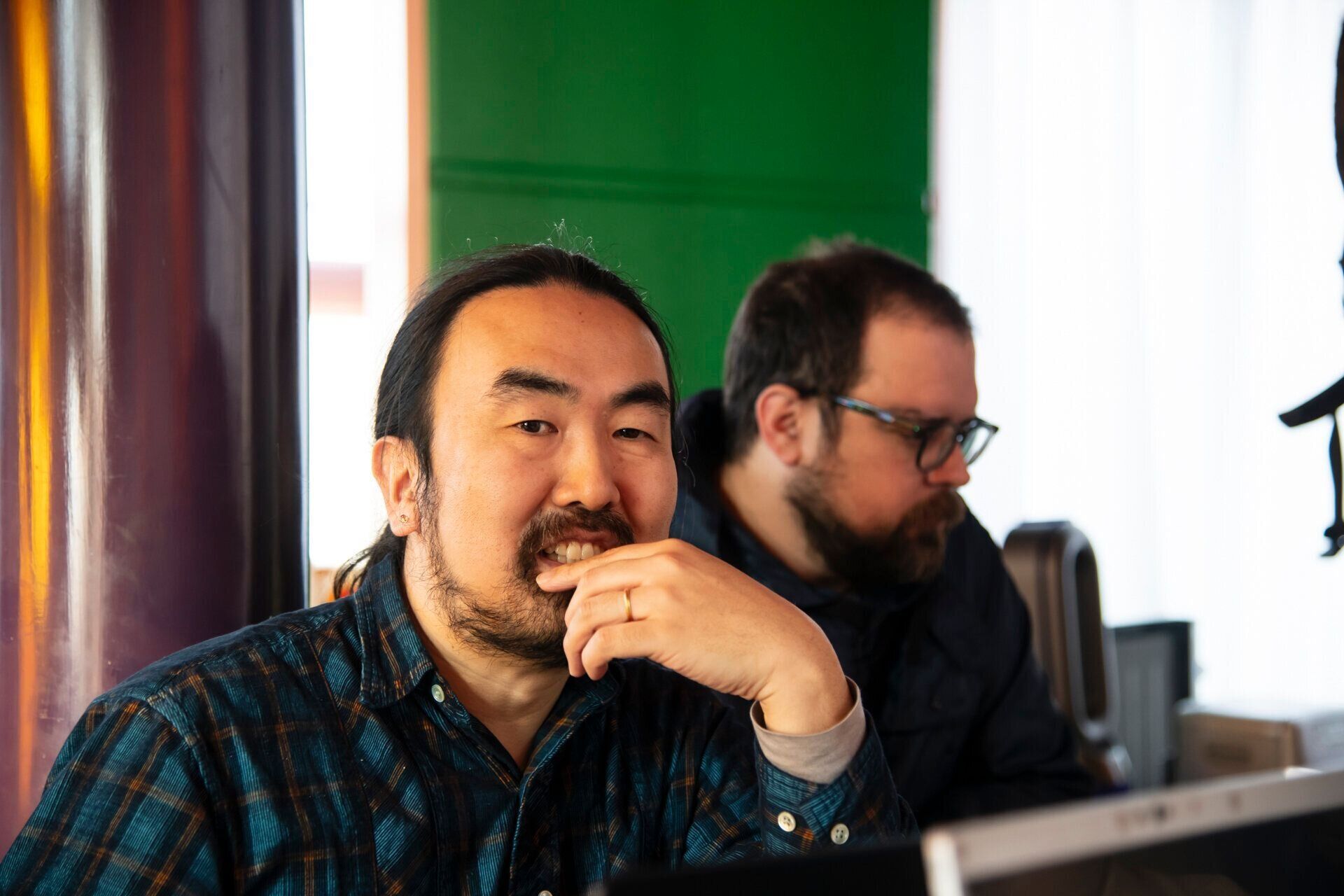 医さんが取材を受ける隣で、パートナーのフォレストさんが仕事をしています。フォレストさんは10歳年下だそうです。