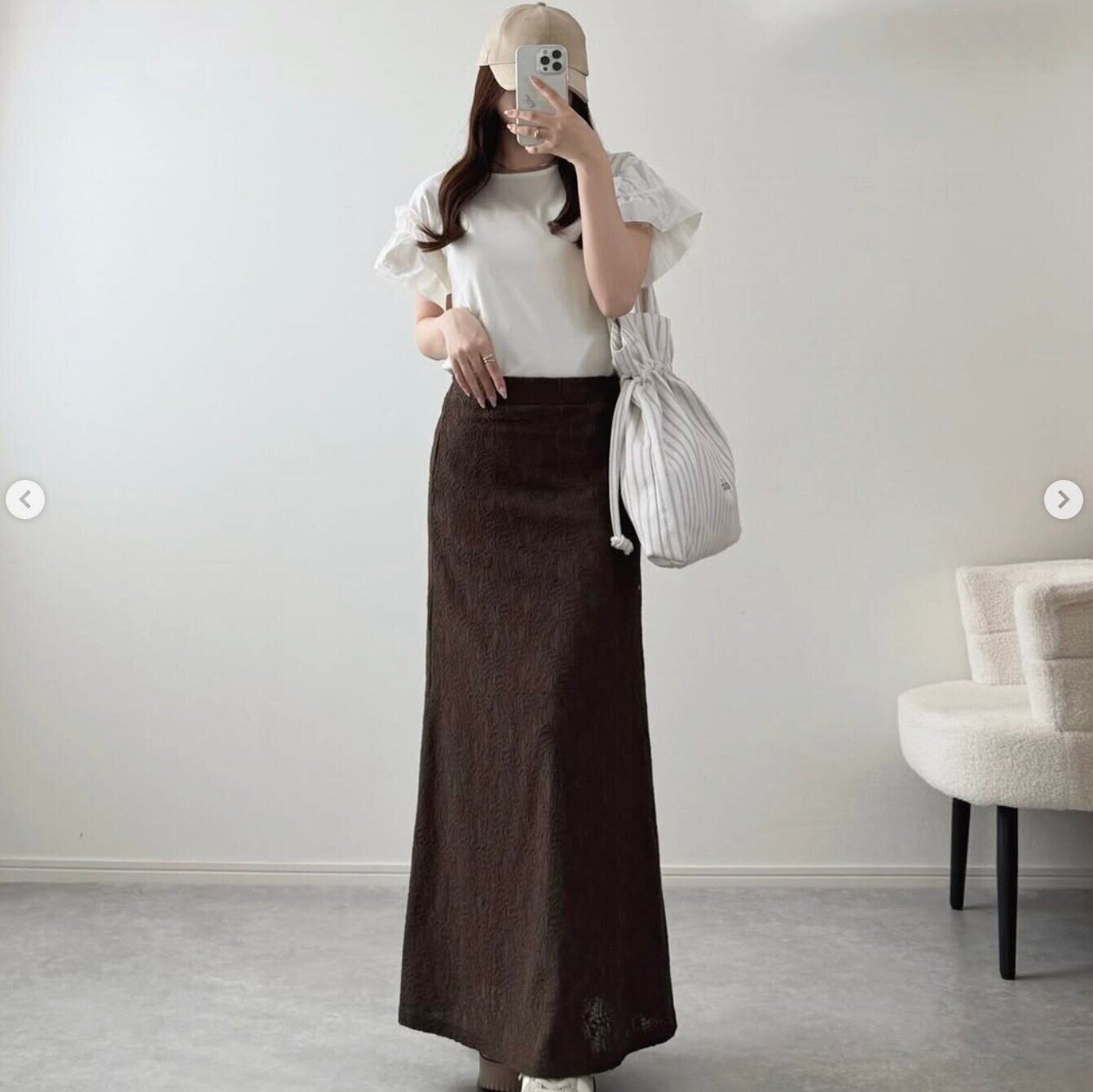 こちらのスカートは、k_______018さんがしまむらでゲットしたもの。ウエスト部分に入ったタック×ドット柄の組み合わせが、大人かわいいデザインですよね♪ くるぶしぐらいの丈感で、「春コーデに使いやすそう」と購入したんだとか◎