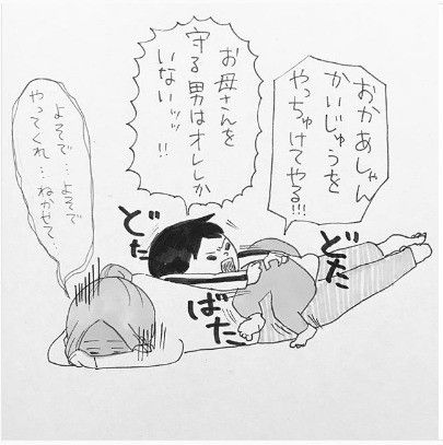 突如始まった兄と弟の戦いごっこ。2人でなかよく遊ぶ様子はとってもほほえましいけれど、なぜかその戦いの場所は、母の背中の上…。背中が痛い! よそでやってくれ~!(涙)…と思うけど、「お母さんを守る」のひと言にちょっとうれしくなりますね。