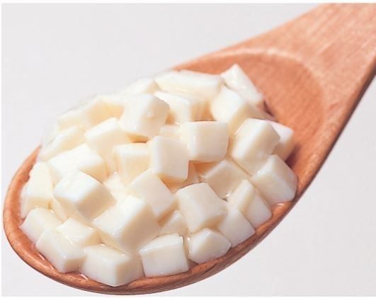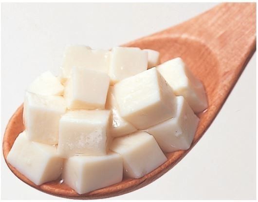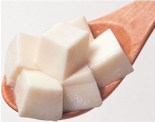 1歳~1歳6ヶ月ごろは、前歯でかじり取って奥の歯ぐきでつぶす練習をします。豆腐は加熱後、1㎝四方の角切りにします。