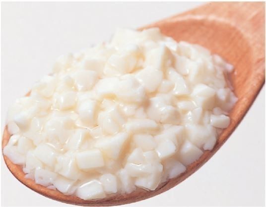 この時期は、奥の歯ぐきでつぶす練習をします。豆腐は、ゆでて、7~8㎜四方の角切りにします。