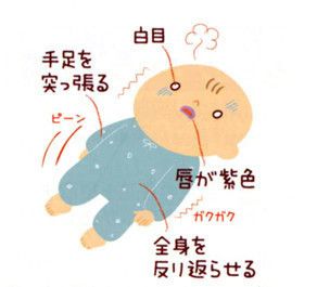 赤ちゃんを抱き上げたり、揺さぶったりせずに、衣類を緩め、吐いたものがのどに詰まらないように顔を横向きにします。口の中にタオルやスプーンなどを入れると、窒息や嘔吐につながり危険です。てんかんなどほかの病気でないか判別するために、目や手足の状態、継続時間、発作後の睡眠の様子などを観察します。