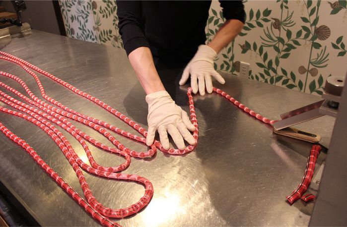 枕型でストライプ柄の可愛いキャンディは、フランス産のゲランドの塩を使用し、ライチ・梅・グレープフルーツ、それぞれのフレーバーに合わせた塩味・酸味・甘みのバランスにこだわって作られています。1袋に3つの味が入っているので、飽きずに楽しむことができますね。