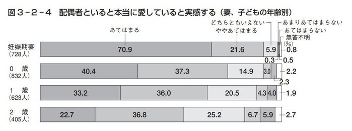 「パパにも育児は自分の役割だと認識してほしいと考えています。というのも、それがパパのためでもあるからです。『産後クライシス』という言葉を聞いたことはありますか? 【図1】の通り妊娠中は70%以上の妻が『夫を愛している』の項目に『あてはまる』答えているのに対して、子どもが2歳になる頃には『あてはまる』と答えている割合は22%にまで減少します。」