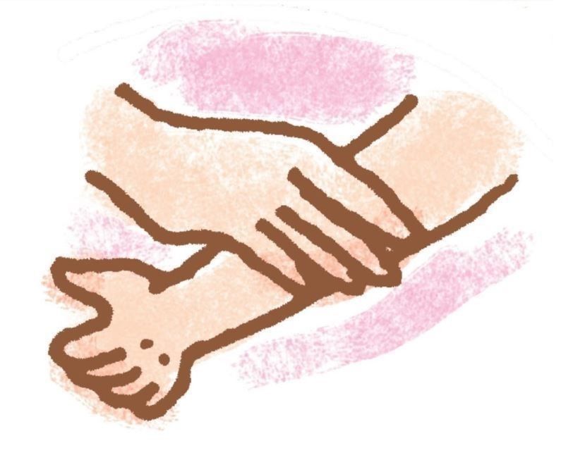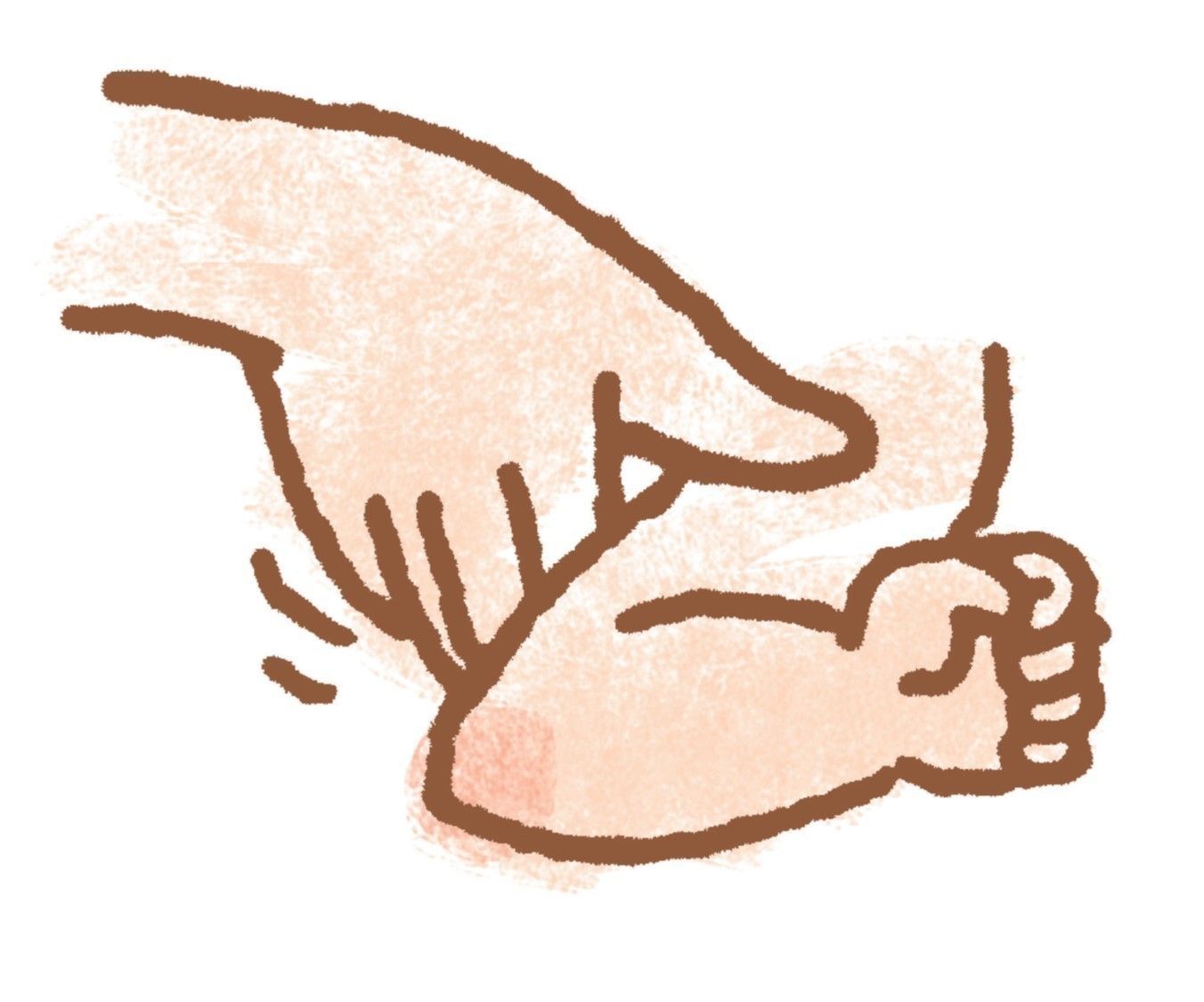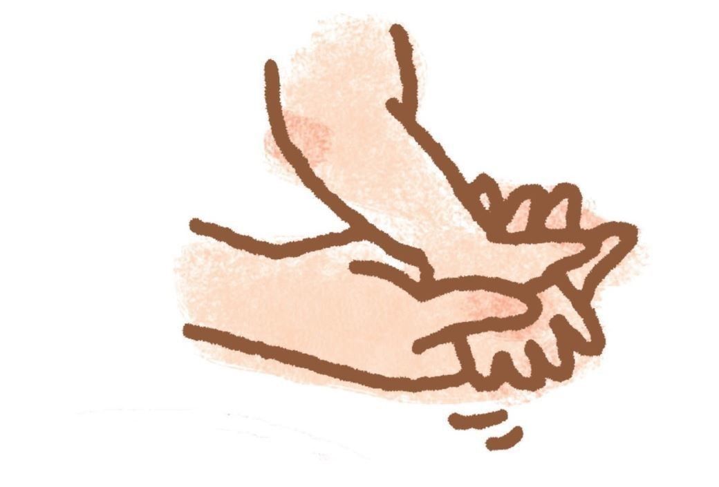 ママ・パパの親指を小指のほうから入れ、手のひらと指の股を洗って。手のひらを閉じているときは、腕を下にすると自然に指が開きます。