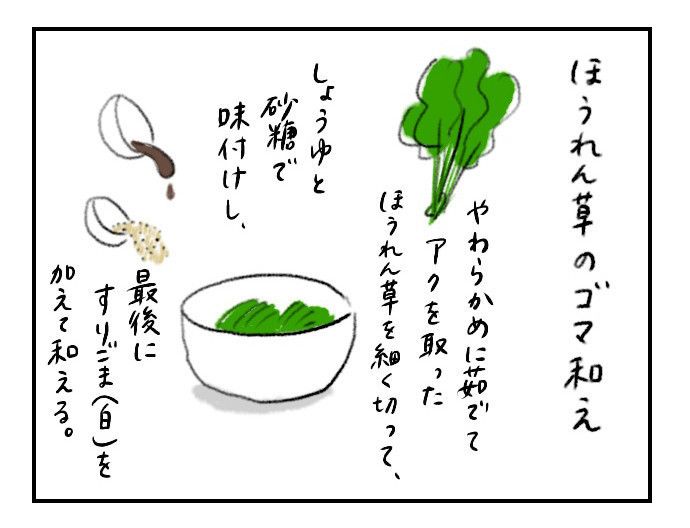 ほうれん草のおひたしも、給食で出てくるほうれん草ぐらいクタクタに煮て細かく切ったら、美味しいと食べてくれるようになりました。