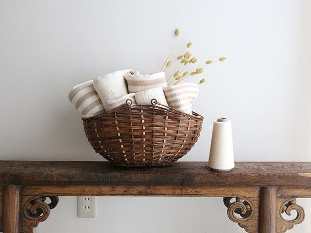 山梨の創業1921年の老舗のはたや『前田源商店』。余計な染料を使わない、コットンそのままの優しい色合いとデザインが、シンプルで飽きのこないブランドです。