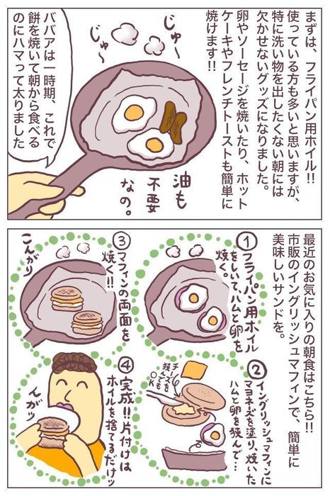 和食でも洋食でも大活躍です。少し漫画にも書きましたが、フライパン用ホイルはお餅を焼くのにも便利ですよ~~!子どもの1歳のお誕生日に一升餅を買うご家庭も多いかもしれませんが、たくさんのお餅もフライパン用ホイルで焼けば簡単に消費できました。