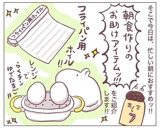 フライパン用ホイルとレンジでらくチンゆでたまご、この2つは今やババア家の朝には必要不可欠!!