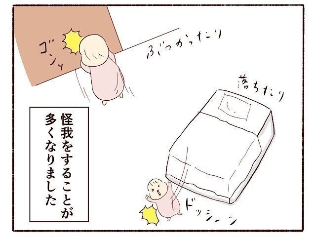 ずりばいが始まると、壁にぶつかったりベッドから落下したりと怪我をすることが多くなりました。「今すごい勢いで頭ぶつけたけど、大丈夫なのかな…