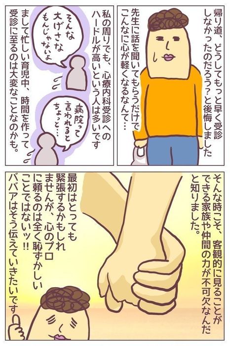 心療内科と言うと少し身構えてしまう方もいらっしゃるかもしれませんが、漫画に描いた通り、つらい状態を改善するために色々なアプローチができるものだなぁと思いました。