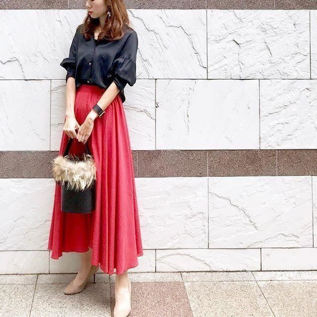 気になる太ももはフレアスカートで隠しつつ、細い足首は出して強調する。