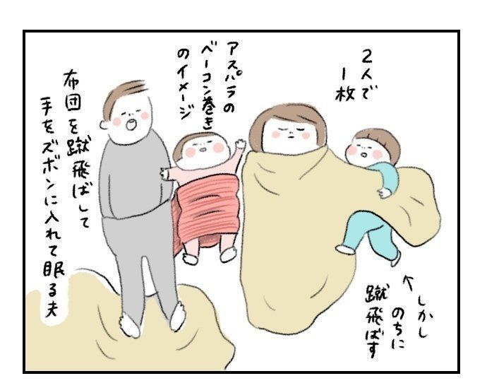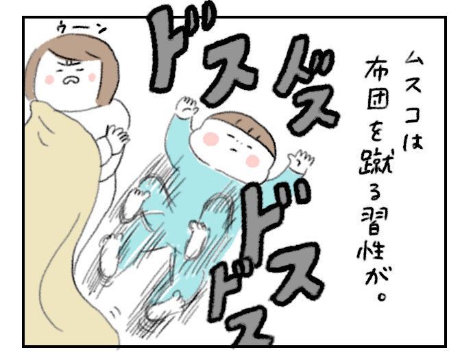 ムスコと私は同じ掛け布団を使用。だいたい布団を蹴飛ばしているけれど、寒いと思ったら自ら布団の中に潜り込んでいるようです。