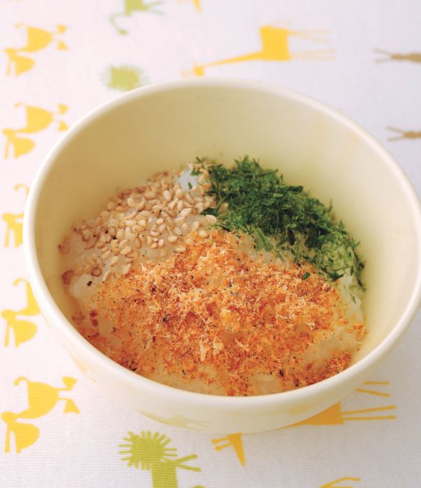 (2)小鍋に5倍がゆ大さじ6、水大さじ1/2を入れて弱火でひと煮立ちさせて器に盛る。(1)、青のり、ごま各小さじ1/2をのせる。