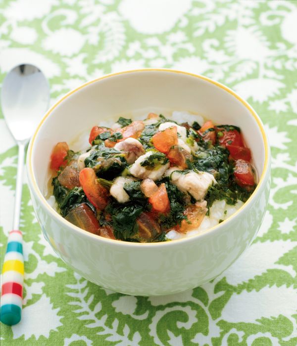 (3)(1)、(2)、だし汁大さじ1を混ぜ合わせ、器に盛った5倍がゆ大さじ3にのせる。