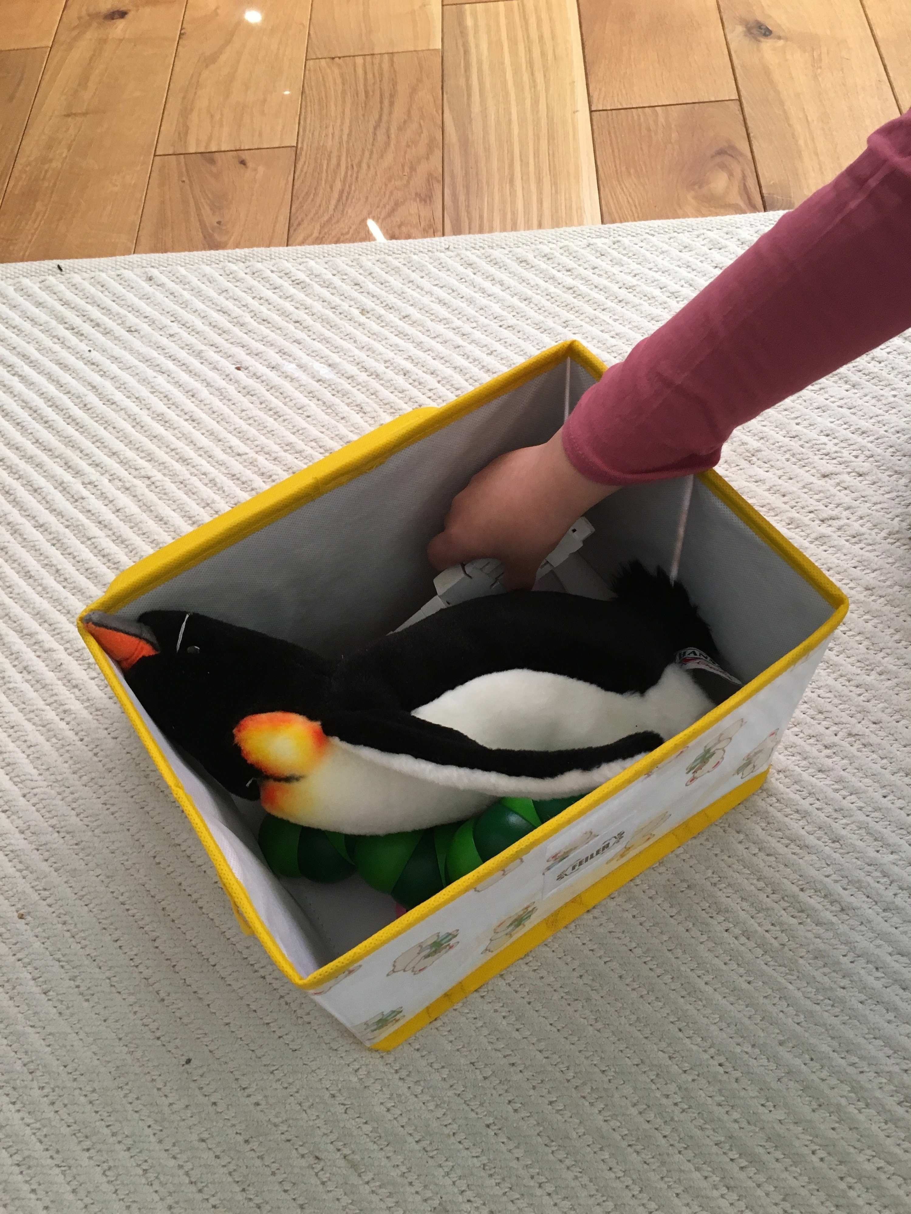 「毎日、園から持ち帰る工作を使って家で遊ぶのが日課なので、ここにまとめておくと探さなくていいし、部屋を移動する時も運びやすいと発見したみたい!」