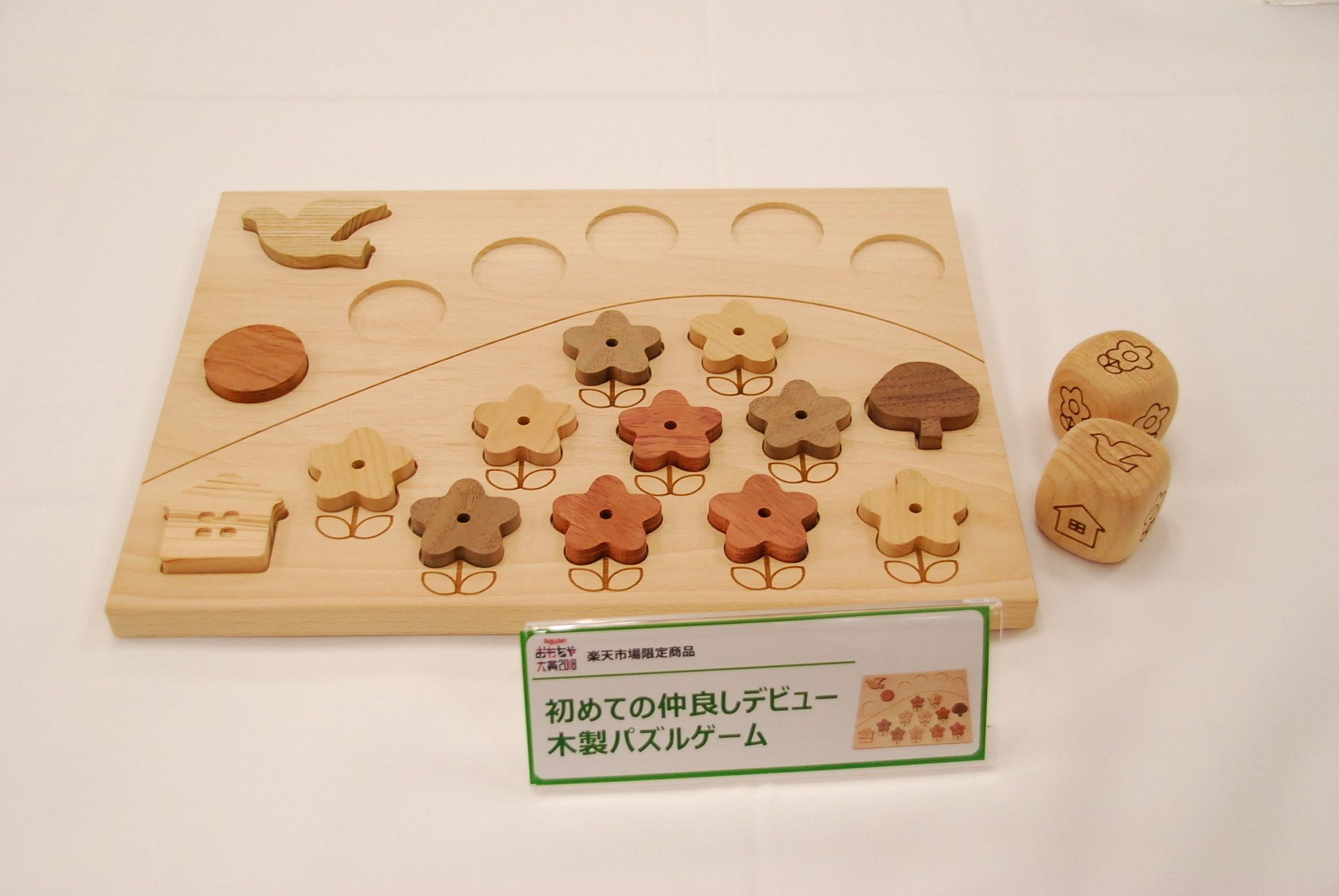 また今回の表彰式では、楽天が主導して開発したオリジナルおもちゃ「初めての仲良しデビュー 木製パズルゲーム」も披露されました。開発に携わったのは、昨年大賞を受賞した「小さな大工さん」。楽天おもちゃ大賞選考委員でもある東大教授・開一夫先生と玩具研究家・岩城敏之さんも監修として加わったおもちゃで、木のぬくもりが感じられるうえに、協力し合ってボードにパズルピースをはめていったり、サイコロを振ってどちらが早くパズルピースをはめられるか競争したりと多様な遊びが可能なおもちゃとなっています。