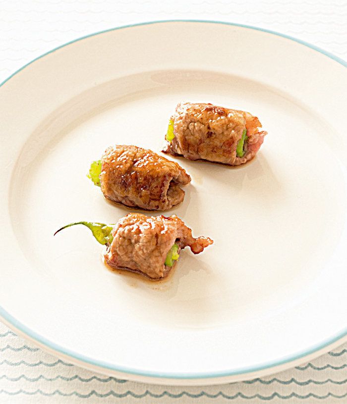 (2)牛薄切り肉(赤身)1枚を広げ、(1)をのせて端からくるくると巻き、全体に小麦粉適宜をまぶす。