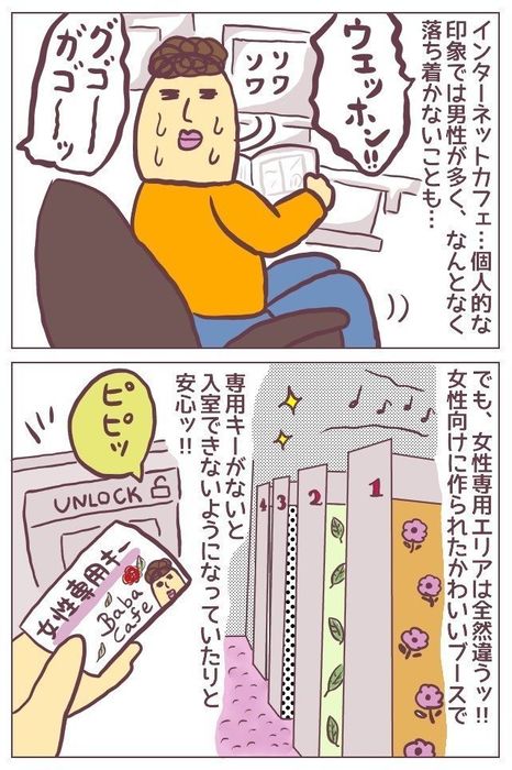 実は私、若い頃にネットカフェでアルバイトをしていたこともあるのですが…やはりオンラインのゲームをしにきた方やカップルなどが多く、「女性1人」のお客さんは少なかった印象でした。やはり友人に聞いてみても、「1人で行ったらかえって落ち着かない」との答えが返ってくることが多く。