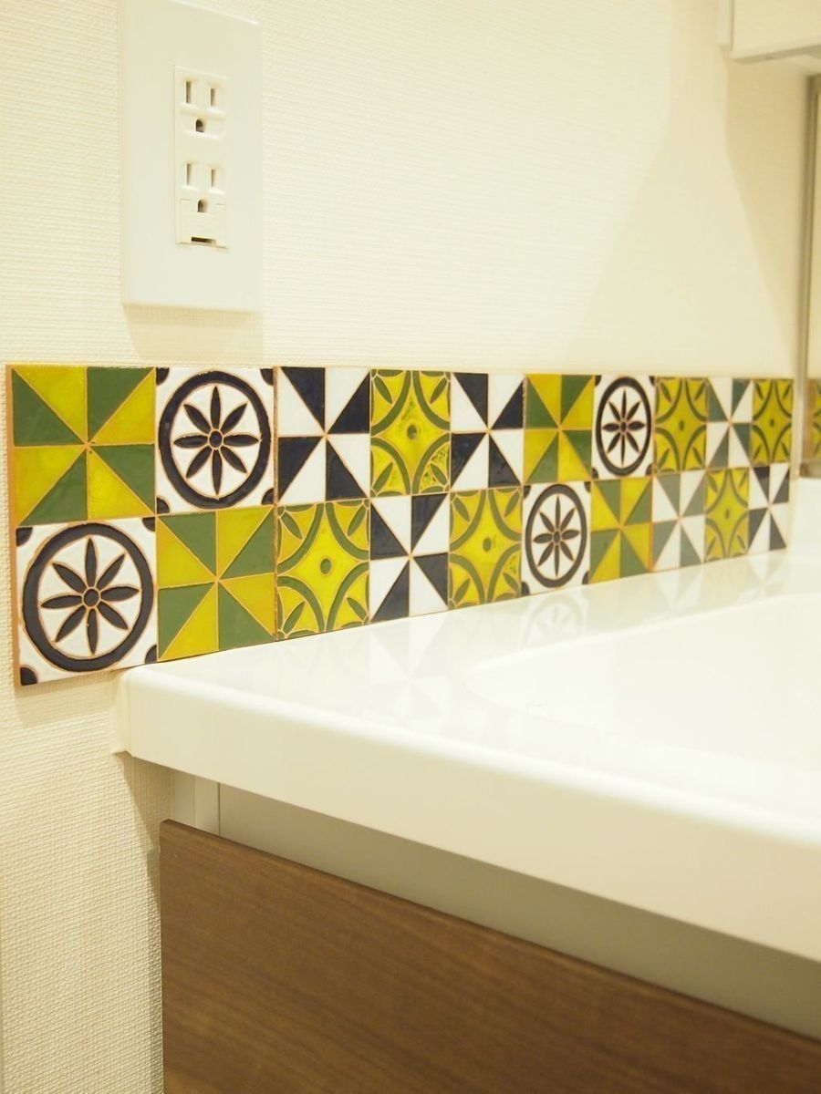 例えば、キッチンの壁全体をタイルにしようと思ったらかなり大掛かりな工事になってしまいますが、まずはお気に入りのタイル1枚貼ってみることからチャレンジしてみましょう!お子さまと一緒に好きな柄や色のタイルを選ぶのも楽しいですね。おすすめはキッチンの油はねが気になる箇所や洗面台の水はね予防にまずは1列貼ってみること。汚れはそのまま放っておくと壁紙がしみになってしまいますが、タイルを並べて貼っておくだけ簡単にふき取れてかわいく清潔に保てます。