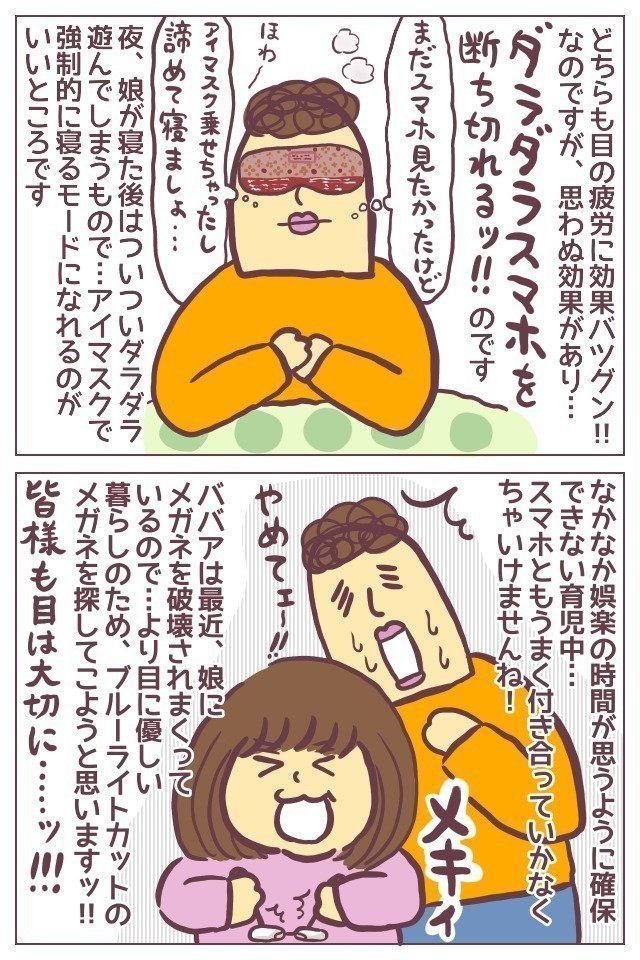 最近ではコンタクトよりメガネにしているババアですが、そのメガネももう娘のせいでグラグラに歪んでいます…。ブルーライトカットのいいやつ、探してきますッ!!