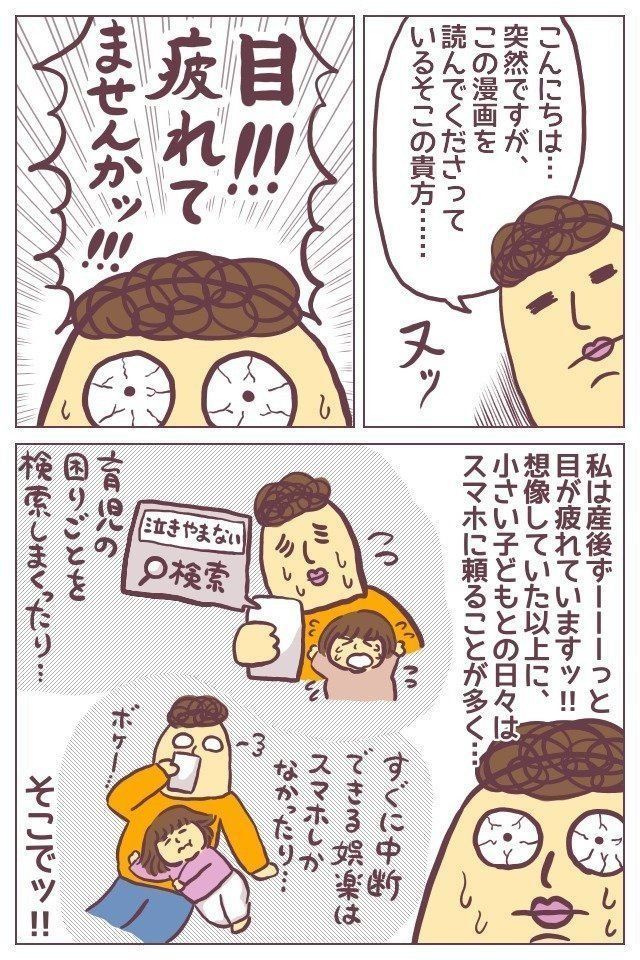 デスクワークでも目が疲れてしまうけど、育児中も意外と目を使っているんですよね~。産後、よく「お産の後は目を使いすぎちゃダメよ!」なんてよく耳にしたものですが、やっぱり隙間時間にできる息抜きってスマホが多かったりします…。