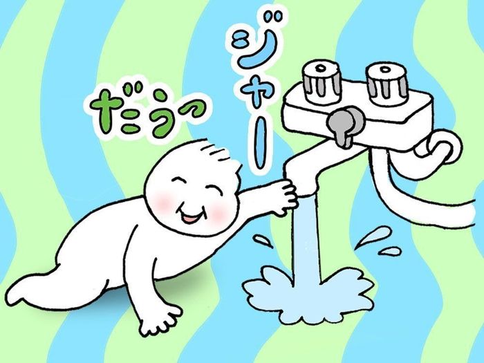 お風呂の中でハイハイしながらお湯が出ているところに自ら突進して行き