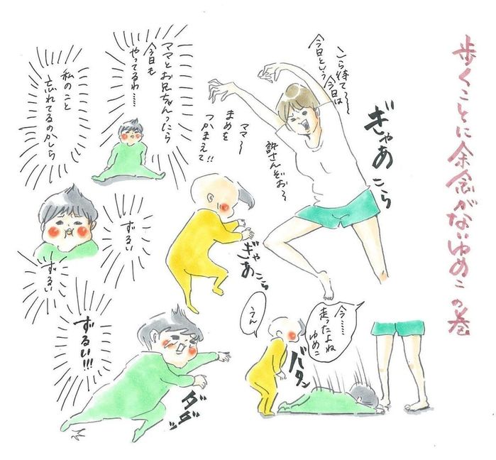 長男・まめちゃんの言動をコミカルに描いた育児絵日記が、インスタグラムで大人気の横峰さん。この連載では、2018年7月末に1才を迎えた第2子・ゆめこちゃんが主役!「うらやましい!」という心理によって突き動かされた、ゆめこちゃんがとった行動とは…。