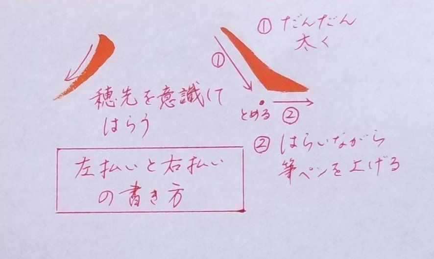 書きあがった字の見映えに大きく影響してきます。写真のように「とめ・はね・はらい」を丁寧に角度に気をつけて書いてくださいね。特に右はらいは、書く時にコツが必要です。段々と太くして、はらいながら筆ペンを上げるように書いていきましょう!