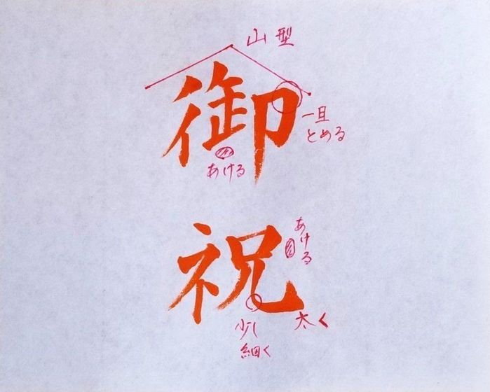 「祝」の漢字はつくりの部分で、口よりも最後のはねが右側に大きくなりますので、気をつけて書いてみましょう。また曲がりの部分は少し細く書いて、はねる時に一番太くなるように、太さにも気をつけて書いてみましょう。