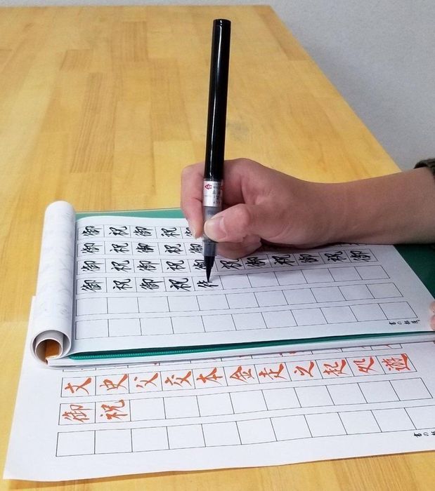 持ち方は、写真のように筆ペンをほぼ垂直に立てて書きます。傾けすぎないように角度に気をつけましょう。実際に教室で練習されている生徒さんの写真です。