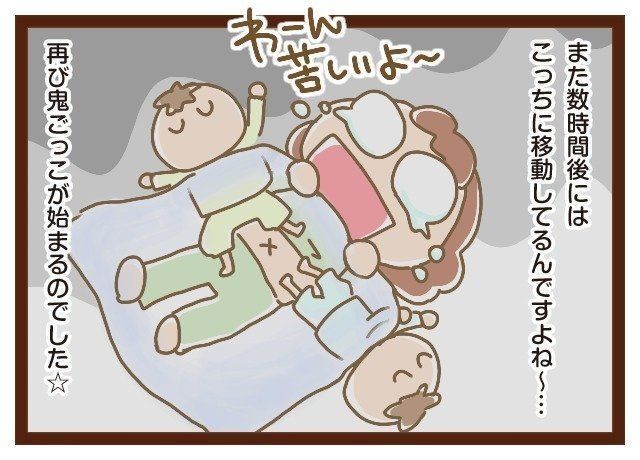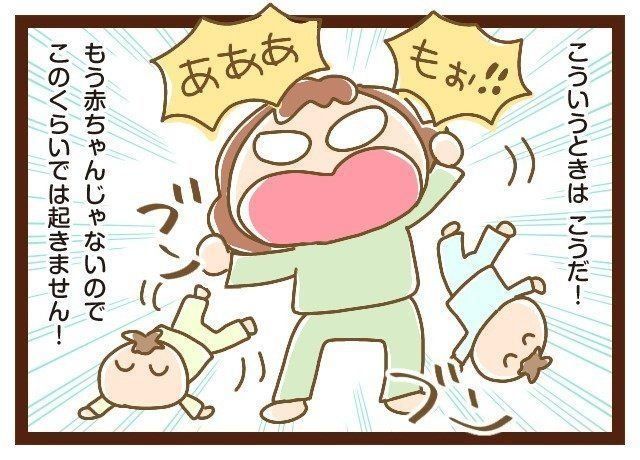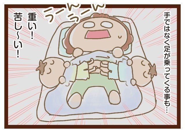 4歳くらいからかな?もう深く寝込むようになったので、このくらいでは起きないので思いっきり振り払います(笑)