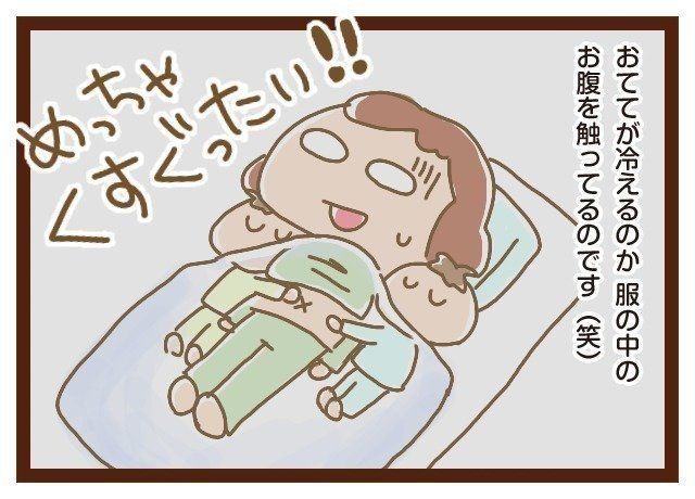 子ども達にお布団はかけるようにしてるのですが布団を蹴っちゃったりするので、手足が冷えてしまうのか、冷たい手が服の中に(主にお腹)入ってくるのです…。温かくて気持ちがいいのかな…??冷たくて小さいおててが入ってきたらくすぐったくてビックリしてしまいます(笑)