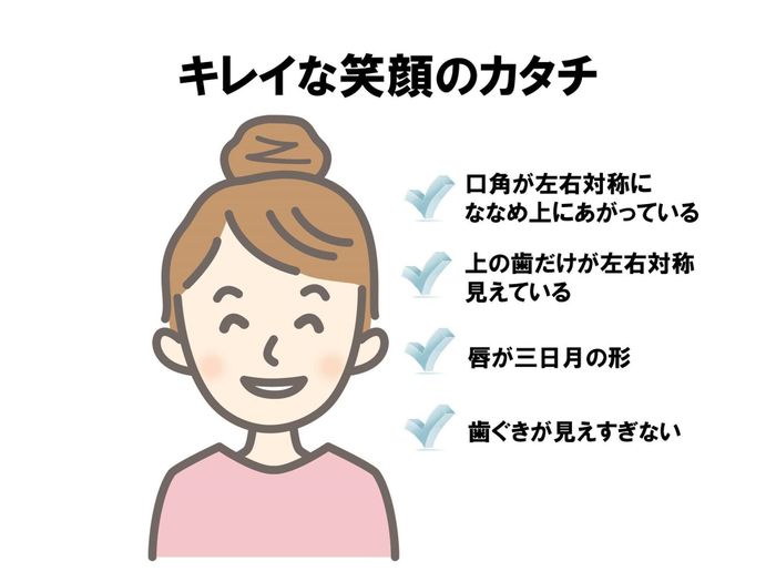 ポイントを押さえれば、だれでもきれいな笑顔をつくることができます。普段笑顔を出すのが慣れていない方が行なうと、ご自身の表情を不自然に感じるかと思います。しかし、少しずつ顔を動かすことで表情を豊かにし、不自然さが緩和されていきますので、何度も練習しましょう。
