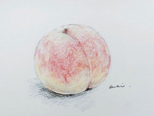 続いて、バランスや位置を見ながら特徴となる形を描きます。林檎、いちごなどへたのついているものであればへたを、桃ならばへこみを描きます。その他、細部をよくみて下描きをします。