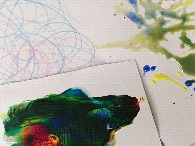 やっとクレヨンや色鉛筆を握れるようになったお子さんは、まだはっきりとした「モノ」を描くことは出来ません。このころのお子さんには自由に「ぐるぐる描き」をさせてあげましょう。絵具をお持ちでしたら、ドリッピングやデカルコマニーもおすすめ。ドリッピングとは、絵の具を多めの水で溶いて画用紙に筆で垂らし、息を吹きかけたり傾けたりして模様を作る遊びです。デカルコマニーは、画用紙の半分に数色の絵の具をチューブから直接出して置いてから半分に折り曲げて少しこすって開きます。または2枚の画用紙を用意して1枚に絵の具を置き、もう1枚をかぶせて回転させたりすると、うずまきのような模様になります。こうして出来た模様を一緒に見て、「ここはチョウチョみたいね」「猫さんかな?」とお話ししながら、ペンやクレヨンで描きこんだりシールを貼って仕上げたりするのも楽しいですね。