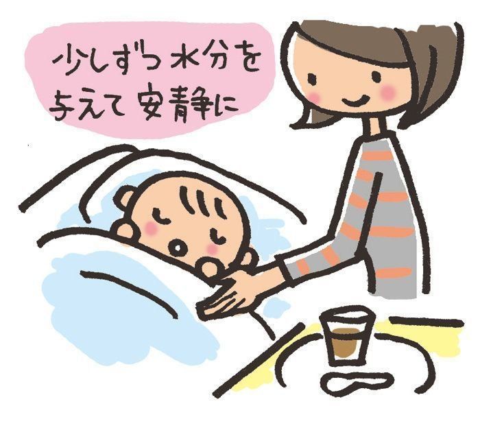 湯冷まし、麦茶などを少しずつ与え、静かにゆっくり休ませましょう。おっぱいやミルクでも構いません。水分を欲しがらないときは、無理に飲ませる必要はありません。