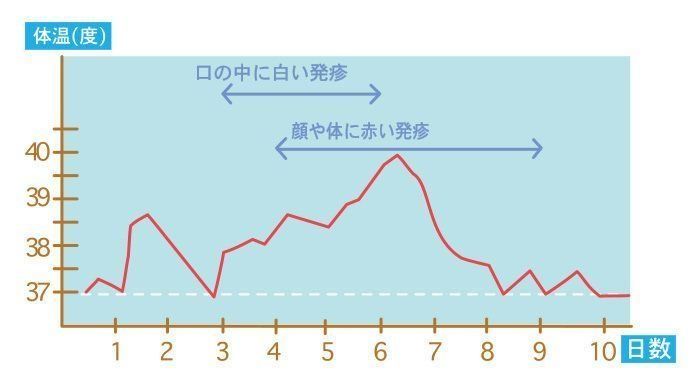 高熱が出て、口や体に発疹が出ます