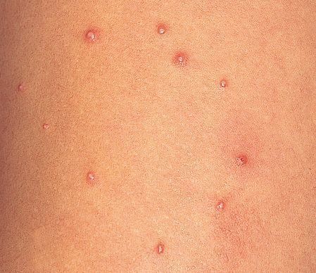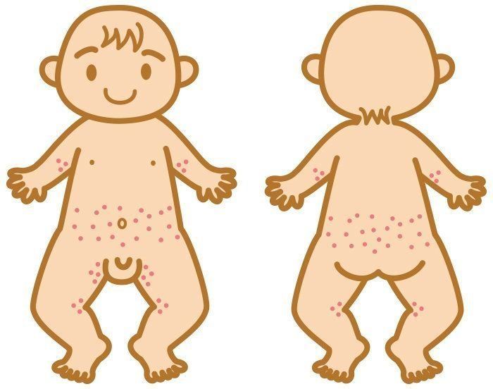 直径1~3mmほどの白や赤いいぼが、胴、ひじ、ひざの裏側を中心に全身にできます。中心にくぼみがあり、水を含んだように見えるのが特徴です。