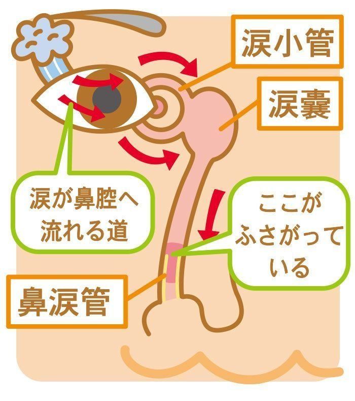 鼻涙管が詰まり、涙が鼻のほうへ流れない病気。自然治癒しない場合は鼻涙管を開通させる手術を。