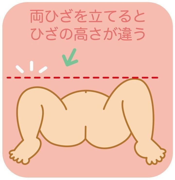 股の関節が緩く、大腿骨の先端が骨盤からはずれる病気です。生まれつきはずれているので痛みはなく、おむつ替えのときに脚の開きが悪かったり、脚のつけ根にできるしわが左右で違ったりすることで気づきます。放置すると歩きだすのが遅くなったり、歩行後は片足を引きずったりすることで発見されます。