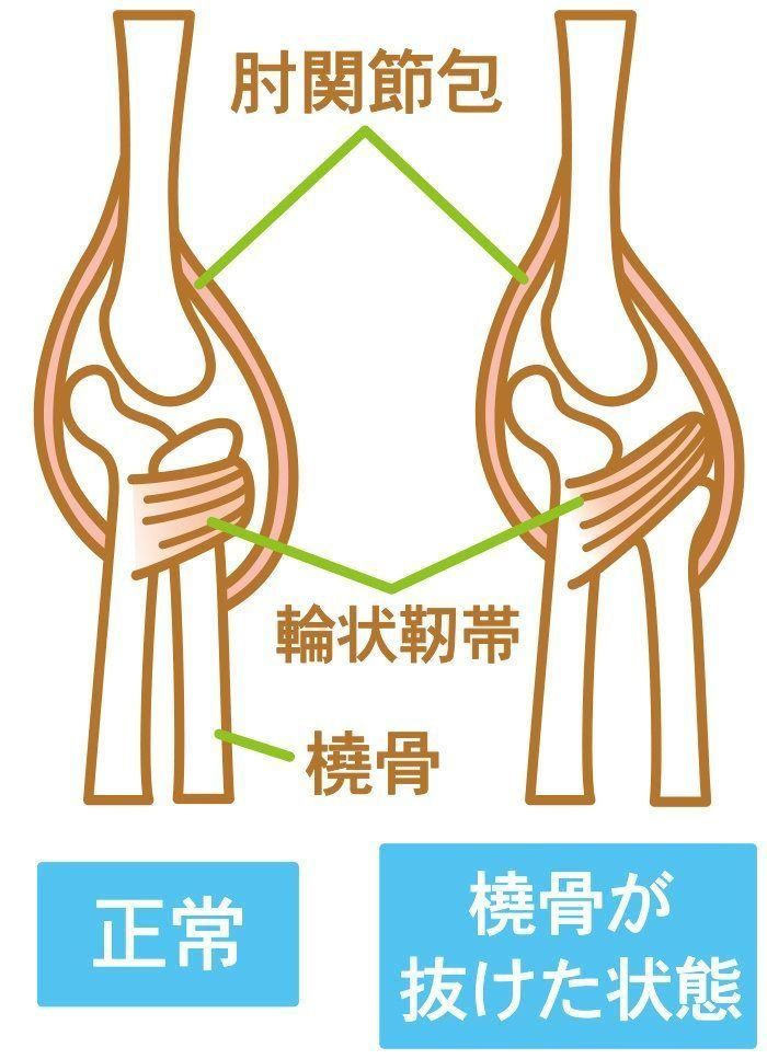 ひじの関節がはずれかけた状態。腕を強く引っ張られると、前腕(ひじから手首まで)の親指側にある橈骨という骨の頭の部分が、ひじ関節の輪状靭帯から一部抜けてしまいます。幼児はひじの関節が緩いために起こります。急に腕をだらんと下げて伸ばしたままになり、少しでもひじを動かすととても痛がり、指しか動かせません。