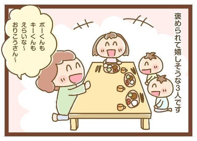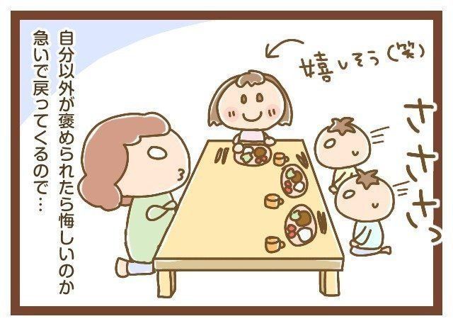 負けたくない!と2人とも戻ってくるのです。そして3人とも大げさに褒め、3人とも嬉しそう!!