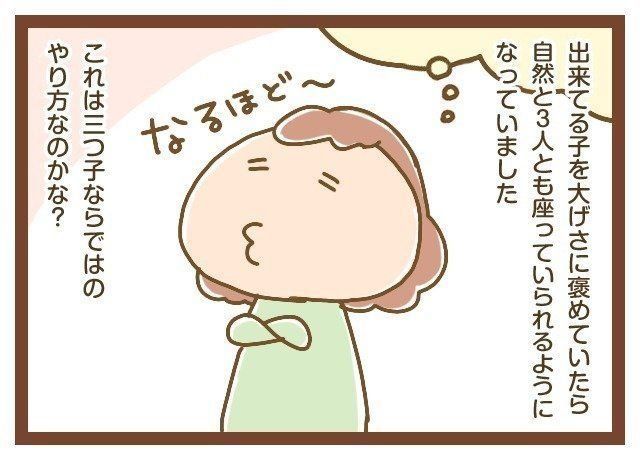うちだけだったら気付かなかったですね。ママ友に言われて、多胎ならでは、三つ子ならではのやり方だなぁと実感したものです。
