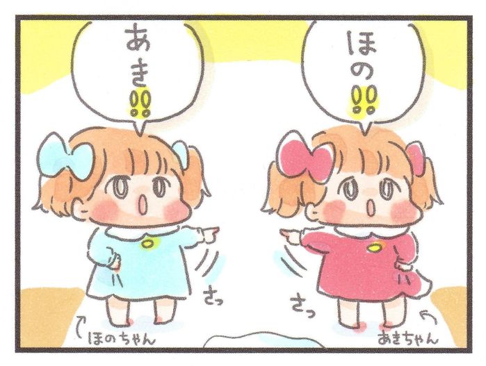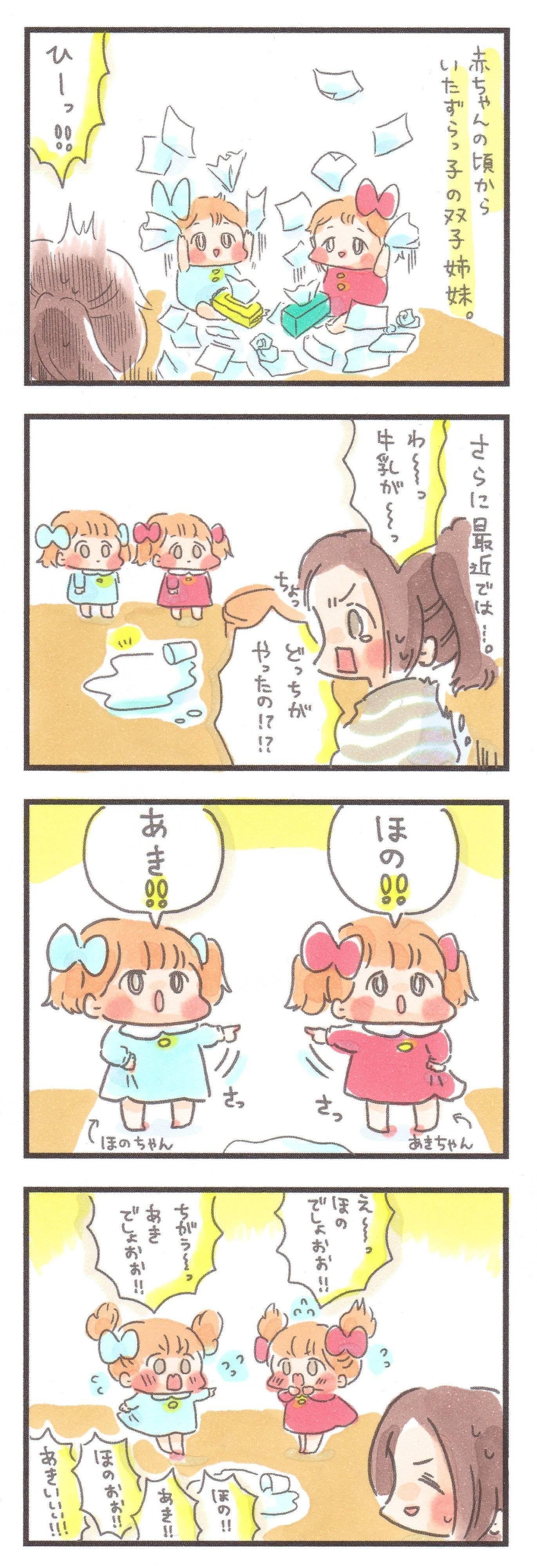 双子ちゃんが、お互いのいたずらを相手の仕業だと言い張ってる姿を想像すると、