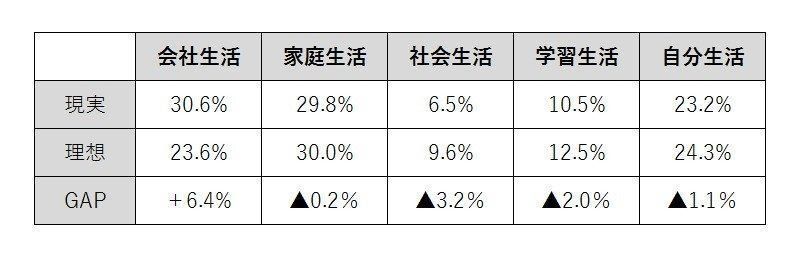 「会社・家庭・社会・学習・自分」という5項目に分けて、理想と現実をそれぞれ聞いたところ、次のような結果になりました。(※3)