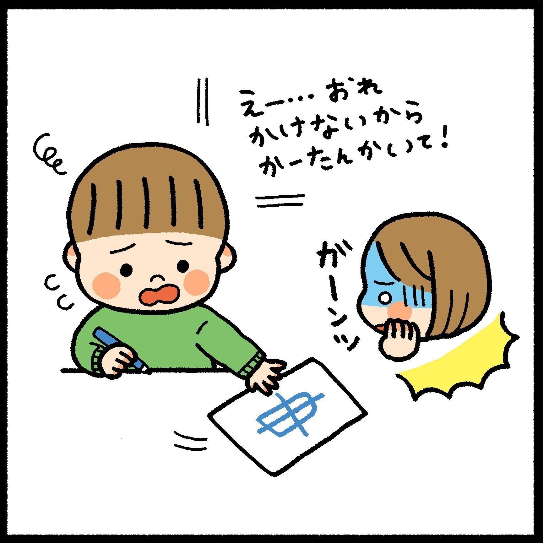 ひーくんもお絵描きが嫌いなわけではなく、色ぬりや折り紙と同じくらい絵も描いているのですが…少し絵に関しては自信がないようです。