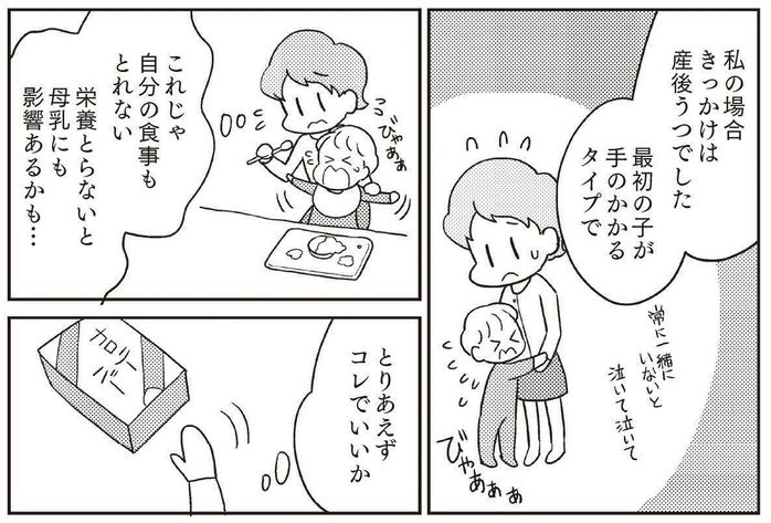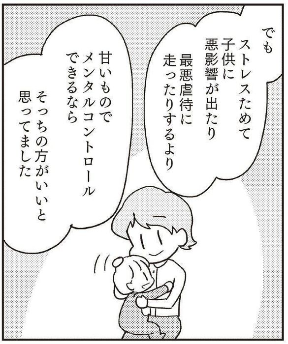 いま振り返ると、「ちゃんとした食事を食べないと」という意識はあったとのこと。しかし、重いストレスに耐えながら育児をするより、甘い物でメンタル面をコントロールしたほうがいいと考えてお菓子を食べていました。育児が大変な今だけと、自分に言い聞かせて……。
