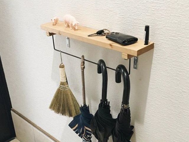 悠里さん(@urii13)は、『セリア』のアイアンバーを棚にセットして、傘を引っ掛けて収納。場所をとらないのでスッキリしますね!