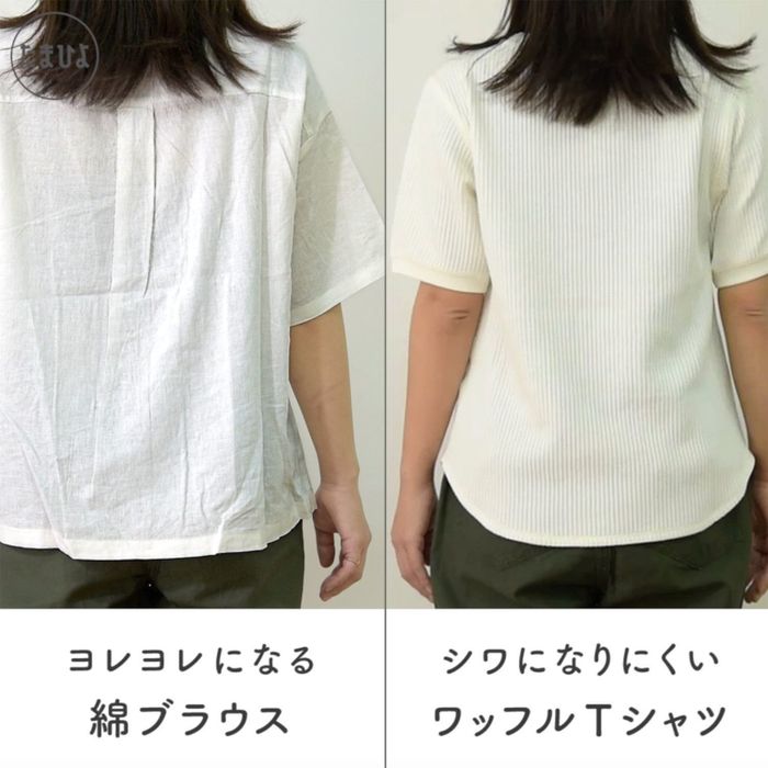 綿ブラウスだとヨレヨレにシワになってしまうところも、ワッフルクルーネックTシャツならシワがつきにくいまま。